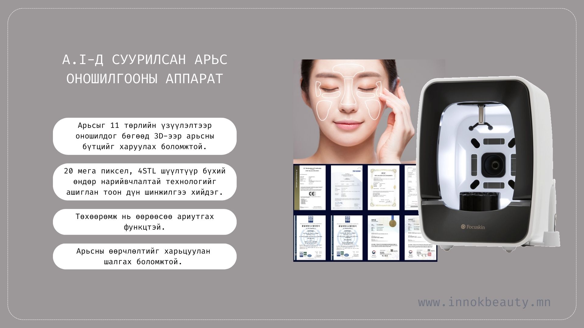 Энэхүү арьс оношилгооны төхөөрөмж нь 11 төрлийн үзүүлэлтээр оношилдог бөгөөд 3D-ээр арьсны бүтцийг харуулах боломжтой.20